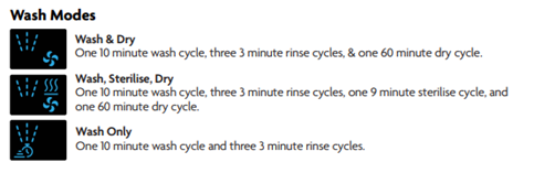 The Bottle Washer Pro is designed to make cleaning your bottles simple and stress-free, with 6 modes covering washing, rinsing, sterilising and drying. See below the cycle times so you can choose what works best for you: