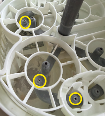 Mineral residue can also buildup inside the jets, this can block water from coming out and stop your bottles from being cleaned fully. This build up can also cause white residue to transfer onto your bottles. Checkout the image below highlighting the buildup in the jets